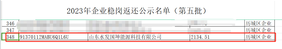 水发国坤公司入选济南市历城区“2023年企业稳岗返还公示名单”